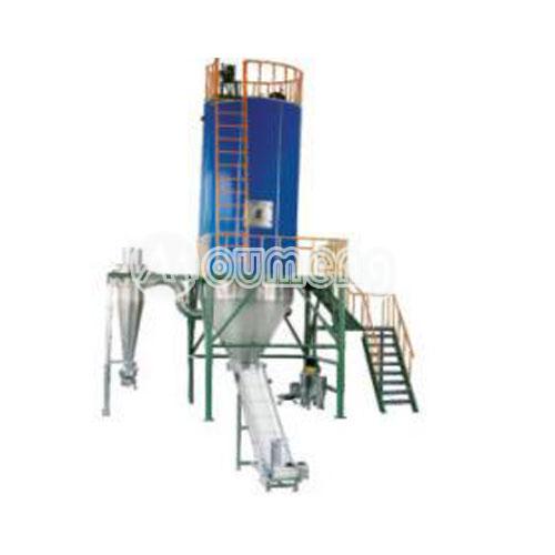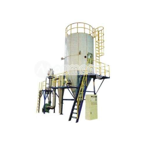 壓力噴霧干燥機是一種可以同時完成干燥和造粒的裝置。按工藝要求可以調節料液泵的壓力,流量,噴孔的大小,得到所需的按一定大小比例的球形顆粒。其工作過程為料液通過隔膜泵高壓輸入,噴出霧狀液滴,然后同熱空氣并流下降,大部分粉粒由塔底排料口收集,廢氣及其微小粉末經旋風分離器分離,廢氣由抽風機排出,粉末由設在旋風分離器下端的授粉筒收集,風機出口處還可裝備二級除塵裝置,回收率在96-98%以上。其與物料接觸部分的塔體、管道、分離器的材料,均采用SUS304制作。在塔體內部與外殼之間有足夠的保溫層,填充材料為超細玻璃棉,塔體設有觀察門、視鏡、光源及控制儀表,由電氣控制操作臺控制和顯示。其熱源裝置采用蒸汽加熱或電加熱器,具有操作方便、啟動快、結構緊湊、熱風干凈清潔等優點。另外在電氣控制柜內裝有電加熱器的控制調節裝置,使進口溫度無級調節。對于缺電地區可采用蒸汽加熱或燃煤、燃油熱風爐等方式,局部或全部代替電加熱裝置。